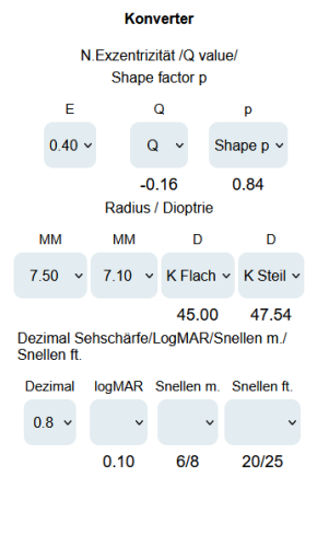 Konverter: zur Umrechnung von Exzentrizitäten, Q-Wert und p-Form.
